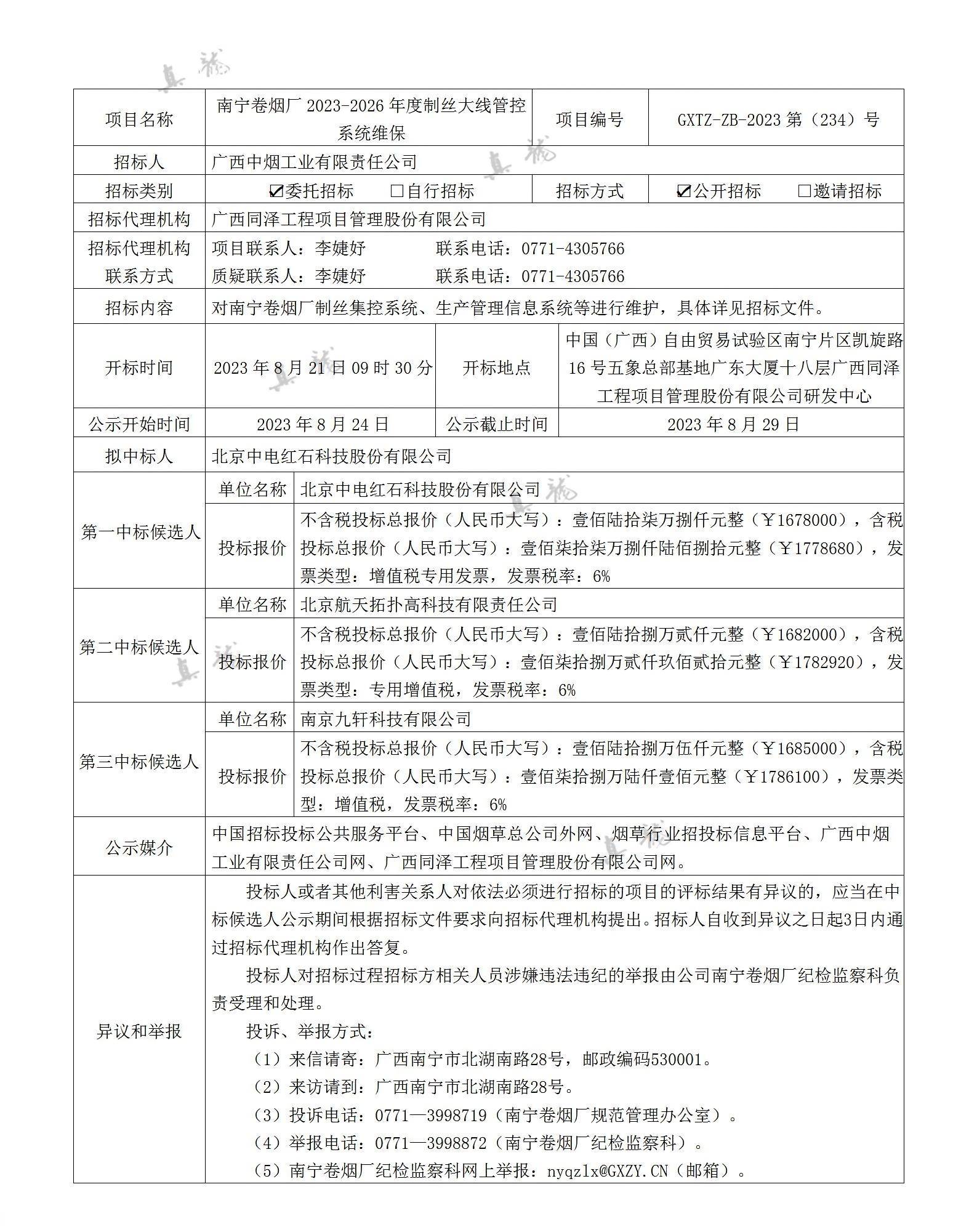 廣西中煙工業(yè)有限責任公司南寧卷煙廠2023-2026年度制絲大線管控系統(tǒng)維保(項目編號:GXTZ-ZB-2023第(234)號)中標候選人公示