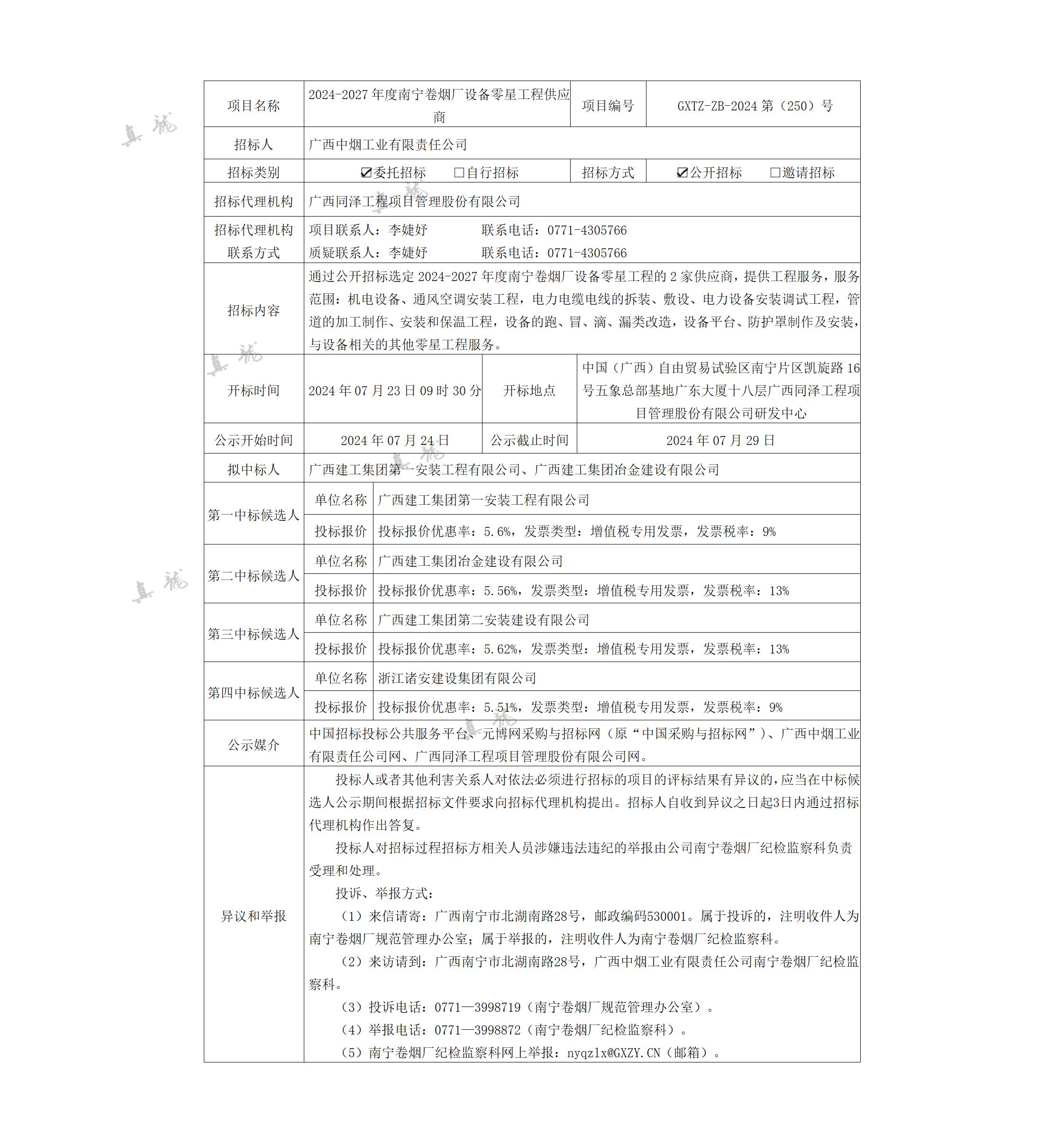 廣西中煙工業(yè)有限責任公司2024-2027年度南寧卷煙廠設(shè)備零星工程供應(yīng)商(項目編號:GXTZ-ZB-2024第(250)號)中標候選人公示