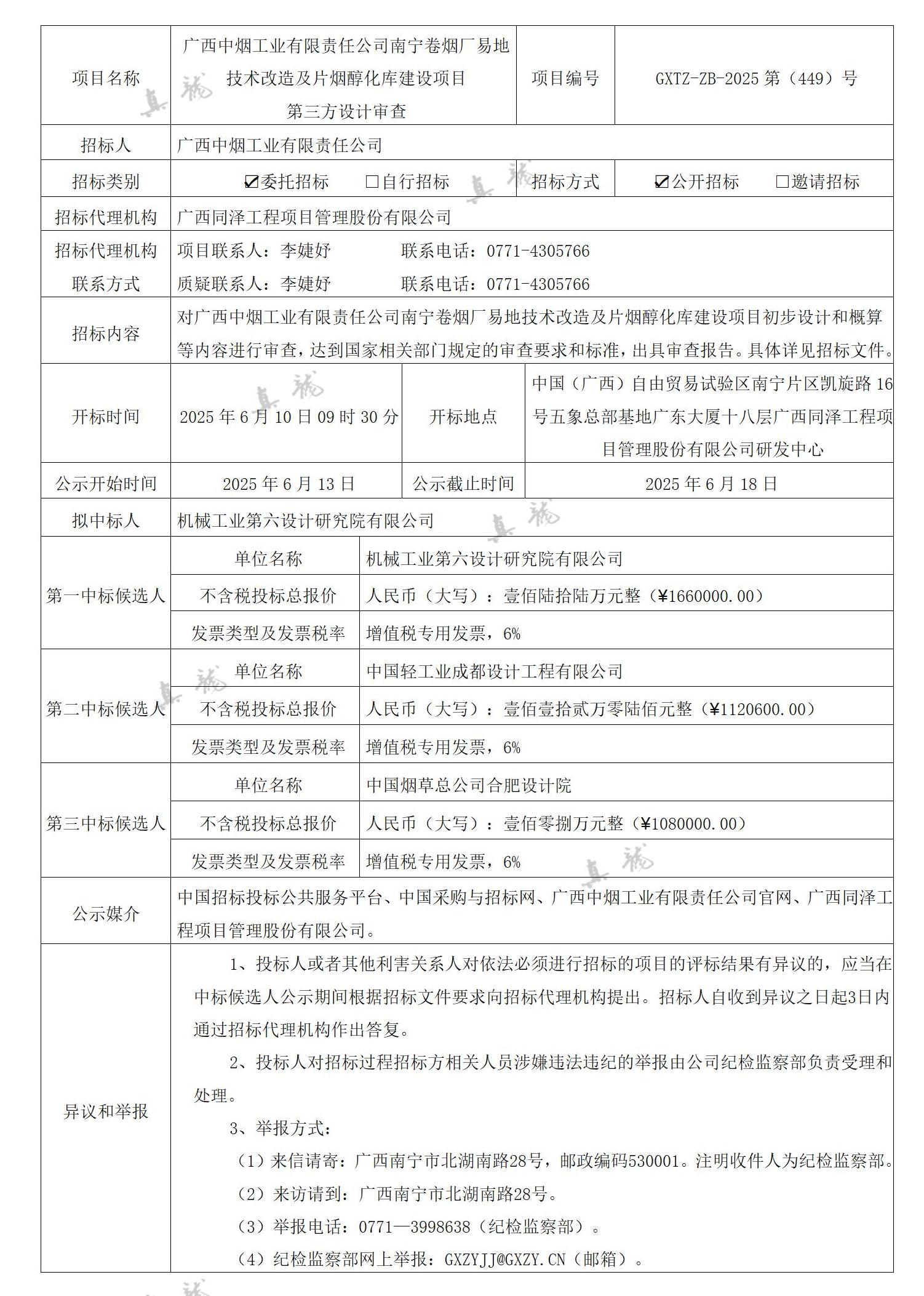 廣西中煙工業(yè)有限責任公司南寧卷煙廠易地技術(shù)改造及片煙醇化庫建設(shè)項目第三方設(shè)計審查(項目編號:GXTZ-ZB-2025第(449)號)中標候選人公示